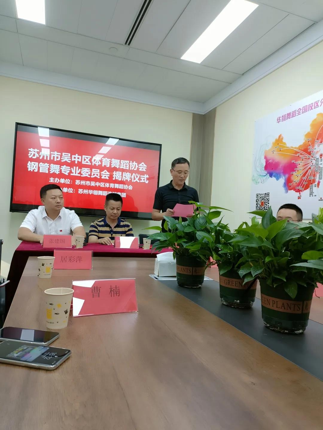 吴中区体育舞蹈运动协会会长姚福土先生致欢迎词,欢迎各位领导和嘉宾参加吴中区体育舞蹈运动协会钢管舞蹈委员会成立仪式,宣布苏州华翎企业管理集团有限公司成为吴中区体育舞蹈运动协会副会长单位。任命了苏州华翎企业管理集团有限公司王小刚同志为吴中区体育舞蹈运动协会副会长,杨彩琴和李清为吴中区钢管舞蹈委员会副主任。