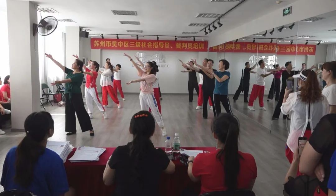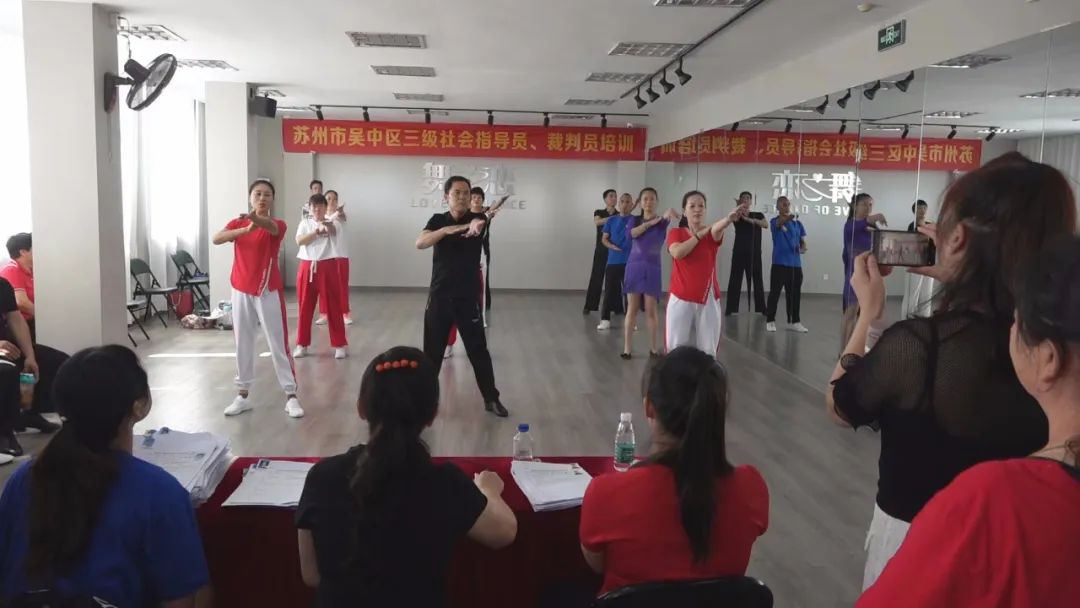 为了进一步适应中国体育舞蹈发展趋势,加强我区体育舞蹈教师队伍及社会体育指导员、裁判员队伍的建设和管理,受苏州市吴中区文化体育和旅游局委托,于2022年7月23日在苏州市吴中区体育舞蹈运动协会舞蹈培训中心举行了吴中区广场舞、健身操三级社会体育指导员、三级裁判员的培训活动。